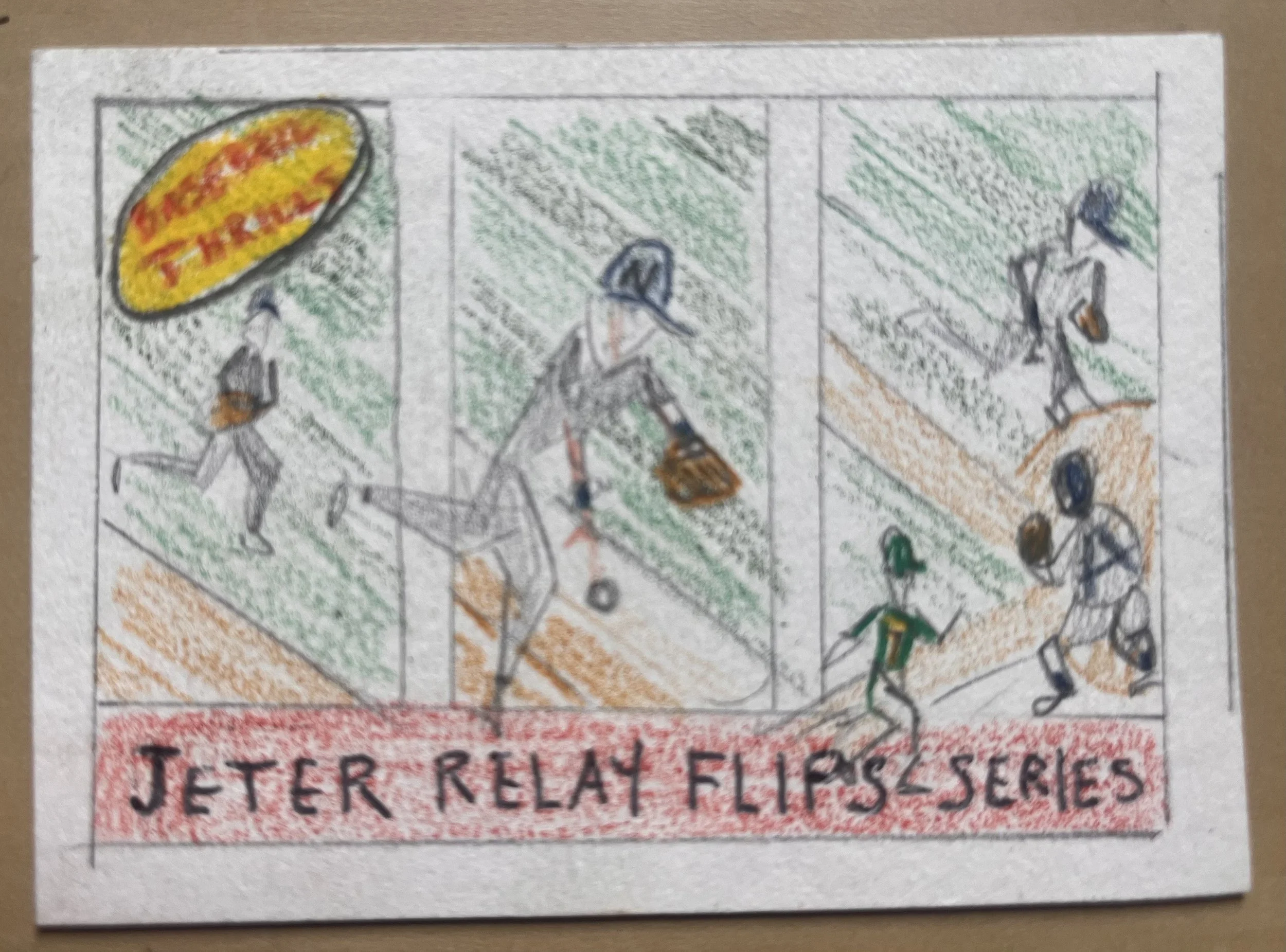 The card I drew of Jeter is based on a sweet Willie Mays from a 1959 Topps subset 'Baseball Thrills'; a three-panel freeze frame of the Say Hey Kid's World Series basket catch in that spacious Polo Grounds outfield.