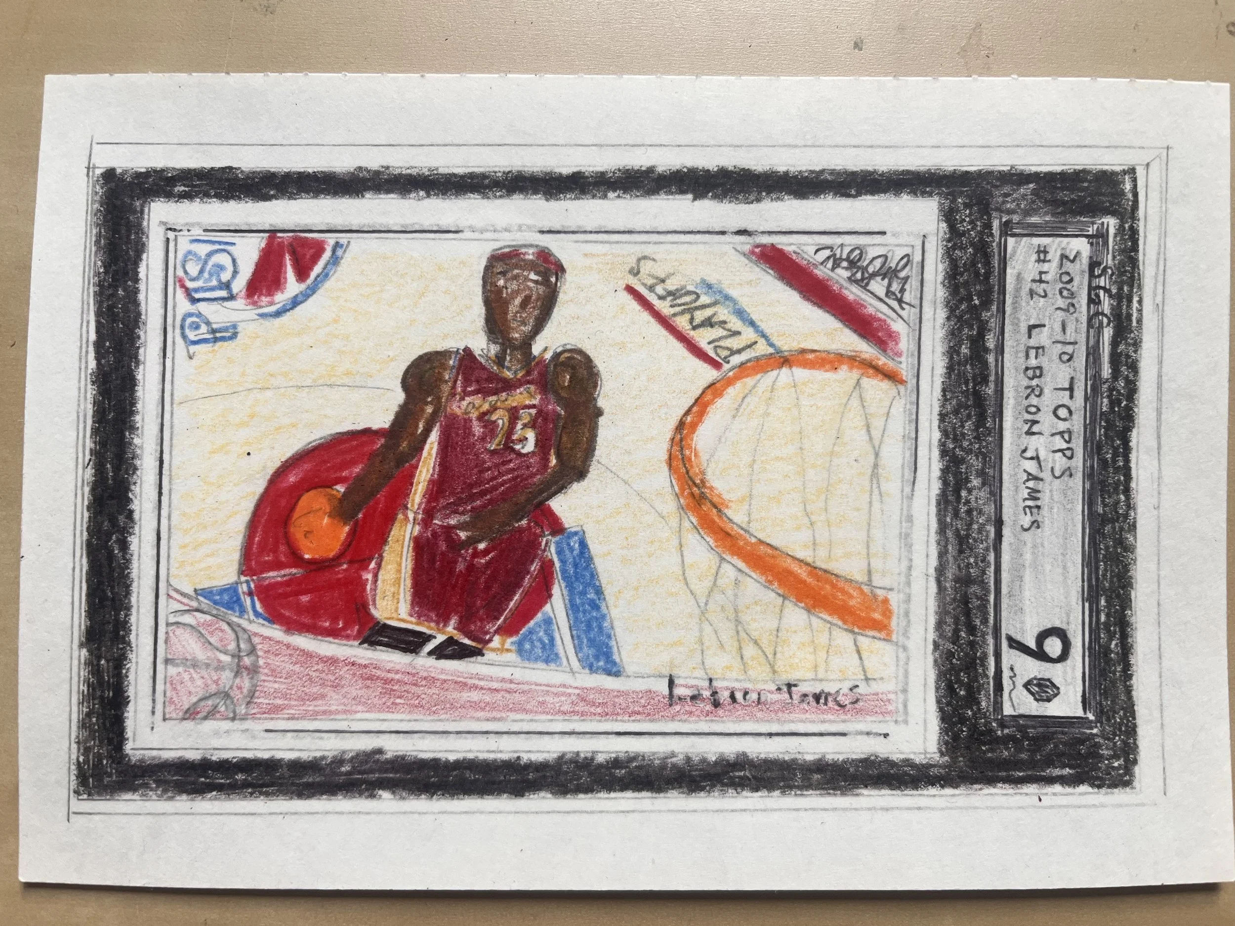 I'm after LeBron's 7 Topps cards, all from his first run with the Cavs. Thing is, I'd rather not spend more than $10. Heck, it's uncommon I pony up $5 for any single. So rather than click 'buy' on the 2009-10 edition, a horizontal view of a patented rim run, I drew it. The photo catches a lot of court of their rival Pistons, yet the King, mid-windmill, is the only player in view. James was that far ahead of anyone else on that play, and in the league, during that era, aside from Kobe.